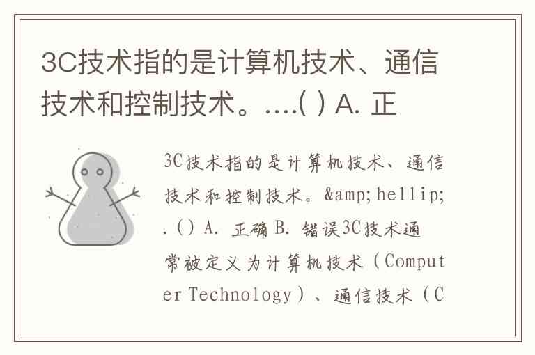 3C技术指的是计算机技术、通信技术和控制技术。….( ) A. 正确 B. 错误