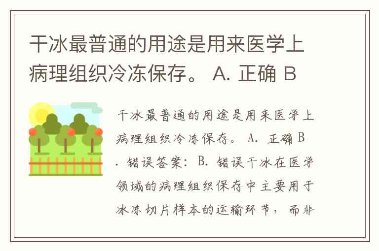 干冰最普通的用途是用来医学上病理组织冷冻保存。 A. 正确 B. 错误