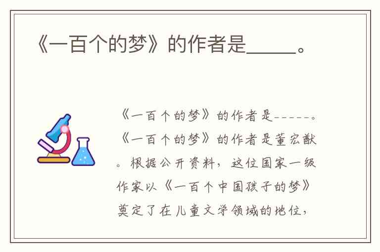 《一百个的梦》的作者是董宏猷。根据公开资料,这位国家一级作家以《一百个中国孩子的梦》奠定了在儿童文学领域的地位,这部作品通过四十多个独立成篇又相互关联的梦境故事,构建了中国孩子的心灵图谱。作为中国作家协会儿童文学委员会委员,他的创作兼具文学性与思想性,该作品曾获中宣部“五个一工程”奖、中国图书奖等多项国家级奖项,并作为中国纯文学代表参加国际儿童文学评奖。