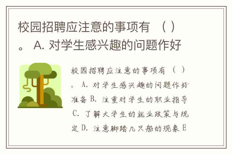 校园招聘应注意的事项有 ( )。 A. 对学生感兴趣的问题作好准备 B. 注重对学生的职业指导 C. 了解大学生的就业政策与规定 D. 注意脚踏几只船的现象 E. 企业应尽快地与学生签署协议
