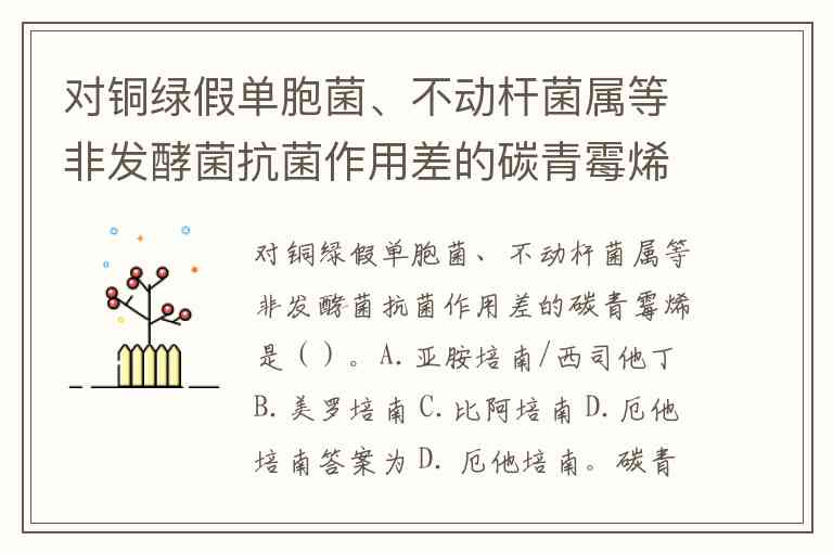 对铜绿假单胞菌、不动杆菌属等非发酵菌抗菌作用差的碳青霉烯是()。A.亚胺培南/西司他丁 B.美罗培南 C.比阿培南 D.厄他培南