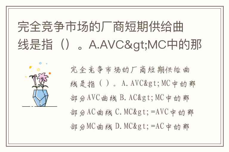 完全竞争市场的厂商短期供给曲线是指()。A.AVC>MC中的那部分AVC曲线 B.AC>MC中的那部分AC曲线 C.MC>=AVC中的那部分MC曲线 D.MC>=AC中的那部分MC曲线