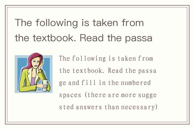 The following is taken from the textbook. Read the passage and fill in the numbered spaces (there are more suggested answers than necessary). Write your answers on the ANSWER SHEET. All of us have read thrilling stories in which the hero had only a limited and specified time to live. 1 . But always we were interested in discovering just how the doomed man chose to spend his last days or his last hours. I speak, of course, of free men who have a choice, not condemned criminals whose sphere of activities is strictly delimited Such stories set us thinking, wondering what we should do under similar circumstances. What s, what experiences, what associations should we crowd into those last hours as mortal beings 2 Sometimes I have thought it would be an excellent rule to live each day as if we should die tomorrow. Such an attitude would emphasize sharply the values of life. We should live each day with a gentleness, a vigor, and a keenness of appreciation which are often lost when time stretches before us in the constant panorama of more clays and months and years to come. 3 , but most people would be chastened by certainty of impending death. In stories, the doomed hero is usually saved at the last minute by some stroke of fortune, but almost always his sense of values is changed. 4 . It has often been noted that those who live, or have lived, in the shadow of death bring a mellow sweetness to everything they do. Most of us, however, take life for granted. We know that one day we must die, but usually we picture that day as far in the future. 5 . We seldom think of it. The days stretch out in an endless vista. So we go about our petty task, hardly aware of our listless attitude toward life. The same lethargy, I am afraid, characterizes the use of all our faculties and senses. Only the deaf appreciate hearing, only the blind realize the manifold blessings that lie in sight. Particularly does this observation apply to those who have lost sight and hearing in life. 6 . Their eyes and ears take in all sights and sounds hazily, without concentration, and with little appreciation. It is the same old story of not being grateful for what we have until we lose it, of not being conscious of health until we are ill. I have often thought it would be a blessing if each human being were stricken blind and deaf for a few days at some time during his early life. 7 . Now and then I have tested my seeing friends to discover what they see. Recently I was visited by a very good friend who had just returned from a long walk in the woods, and I asked her what she had observed. "Nothing in particular." She replied. 8 , for long ago I became convinced that the seeing see little. How was it possible, I asked myself, to walk for an hour through the woods and see nothing worthy of note 9 . I feel the delicate symmetry of a leaf. I pass my hands lovingly about the smooth skin of a silver birch, or the rough shaggy bark of a pine. In spring I touch the branches of trees hopefully in search of a bud, the first sigh of awakening Nature after her winter’s sleep. I feel the delightful, velvety texture of a flower, and discover its remarkable convolution; and something of the miracle of Nature is revealed to me. Occasionally, if I am very fortunate, I place my hand gently on a small tree and feel the happy shiver of a bird in full song. I am delighted to have the cool waters of a brook rush through my open fingers. 10 . To me the pageant of seasons is a thrilling and unending drama, the action of which streams through my fingertips. A.Sometimes it was as long as a year; sometimes as short as twenty-four hours B.This is a basic fact to keep in mind C.But those who have never suffered impairment of sight or hearing seldom make the fullest use of these blessed faculties D.He becomes more appreciative of the meaning of life and its permanent spiritual values E.Darkness would make him more appreciative of sight; silence would teach him the joys of sound F.There are those, of course, who would adopt the epicurean motto of "Eat, drink, and be merry" G.In this way, the survivors can become all-powerful H.I who cannot see find hundred of things to interest me through mere touch I.When we are in buoyant health, death is all but unimaginable J.I might have been incredulous had I not been accustomed to such responses K.To me a lush carpet of pine needles or spongy grass is more welcome than the most luxurious Persian rug L.What happiness should we find in reviewing the past, what regrets The following is taken from the textbook. Read the passage and fill in the numbered spaces (there are more suggested answers than necessary). Write your answers on the ANSWER SHEET.