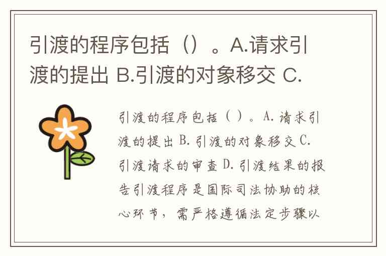 引渡的程序包括()。A.请求引渡的提出 B.引渡的对象移交 C.引渡请求的审查 D.引渡结果的报告