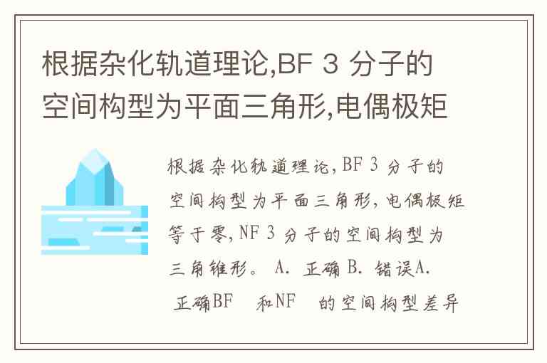 根据杂化轨道理论,BF 3 分子的空间构型为平面三角形,电偶极矩等于零,NF 3 分子的空间构型为三角锥形。 A. 正确 B. 错误