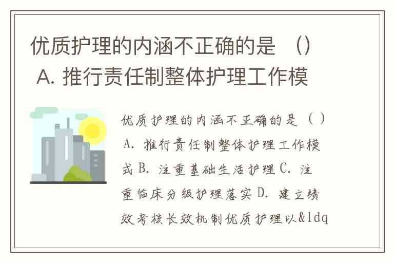 优质护理的内涵不正确的是 () A. 推行责任制整体护理工作模式 B. 注重基础生活护理 C. 注重临床分级护理落实 D. 建立绩效考核长效机制