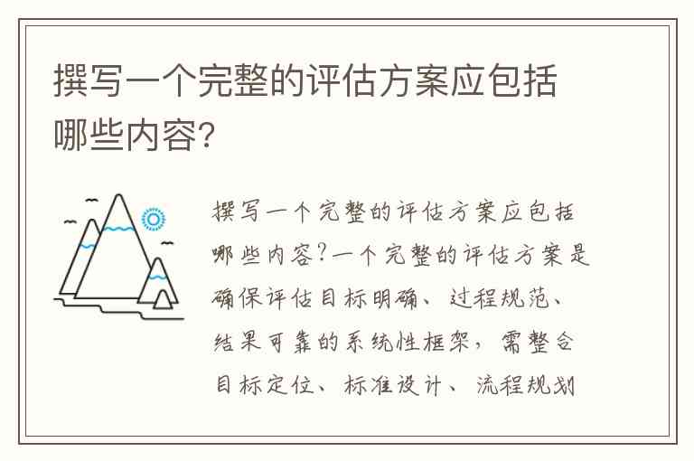 一个完整的评估方案是确保评估目标明确、过程规范、结果可靠的系统性框架,需整合目标定位、标准设计、流程规划和结果应用等核心要素。无论是企业绩效评估、项目可行性分析还是资产价值评估,科学的方案结构都能显著提升评估质量。