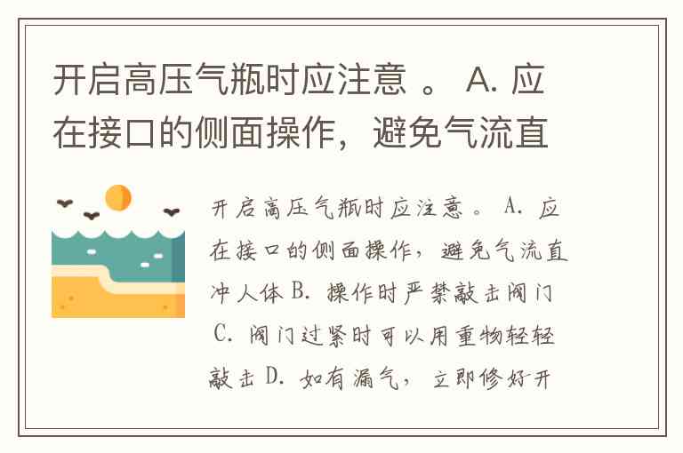 开启高压气瓶时,操作人员需严格遵循“安全优先、规范操作”原则,避免因气流冲击、机械损伤或泄漏处理不当导致事故。以下是对各选项的具体分析及操作要点: