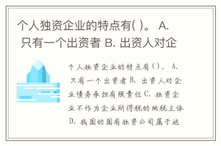 个人独资企业的特点有( )。 A. 只有一个出资者 B. 出资人对企业债务承担有限责任 C. 独资企业不作为企业所得税的纳税主体 D. 我国的国有独资公司属于这类独资企业