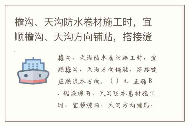 檐沟、天沟防水卷材施工时,宜顺檐沟、天沟方向铺贴,搭接缝应顺流水方向。() A. 正确 B. 错误