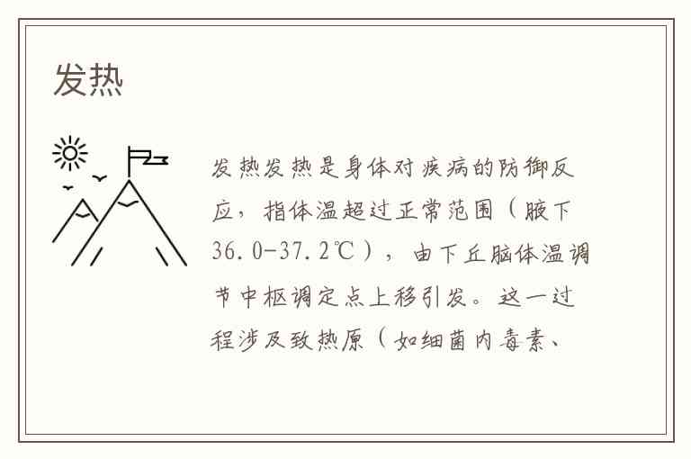 发热是身体对疾病的防御反应,指体温超过正常范围(腋下36.0-37.2℃),由下丘脑体温调节中枢调定点上移引发。这一过程涉及致热原(如细菌内毒素、病毒)刺激免疫细胞释放细胞因子,最终通过前列腺素E2升高体温调定点,导致血管收缩减少散热、寒战增加产热。