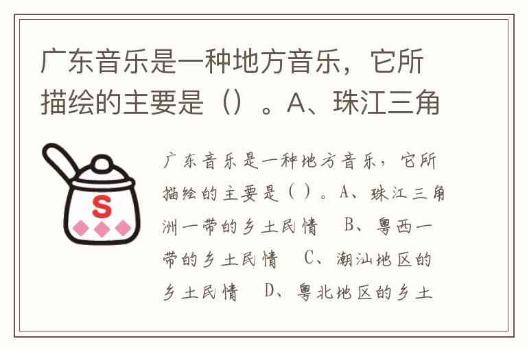 广东音乐是一种地方音乐,它所描绘的主要是()。A、珠江三角洲一带的乡土民情 B、粤西一带的乡土民情 C、潮汕地区的乡土民情 D、粤北地区的乡土民情