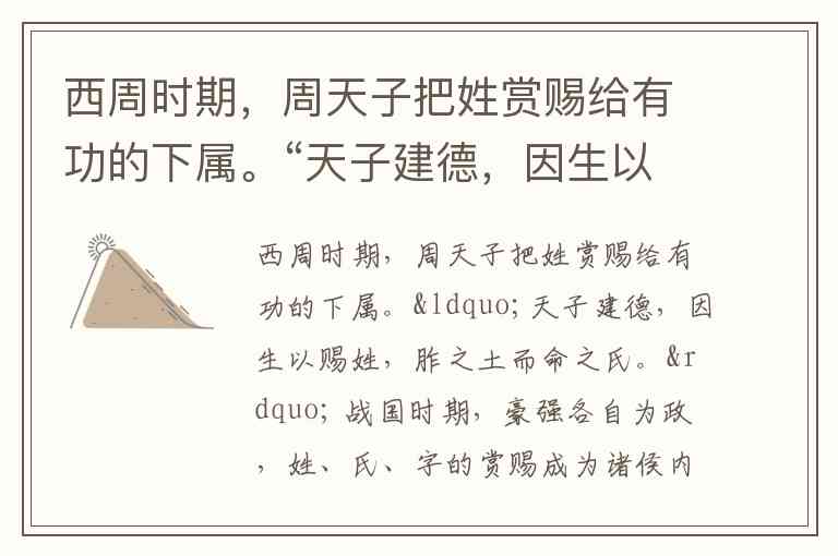 西周时期“天子建德,因生以赐姓,胙之土而命之氏”的制度,本质上是宗法制的核心体现——周天子作为天下大宗垄断姓氏赏赐权,通过“赐姓命氏”确立贵族血缘等级秩序。而战国时期诸侯自行掌握这一权力,反映的是宗法制崩溃后,原有血缘政治体系的瓦解。