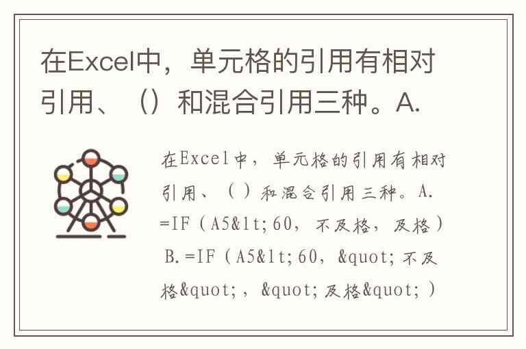 在Excel中,单元格的引用有相对引用、()和混合引用三种。A.=IF(A5<60,不及格,及格) B.=IF(A5<60,"不及格","及格") C.=IF(A5<60,及格,不及格) D.=IF(A5<60,"及格","不及格")