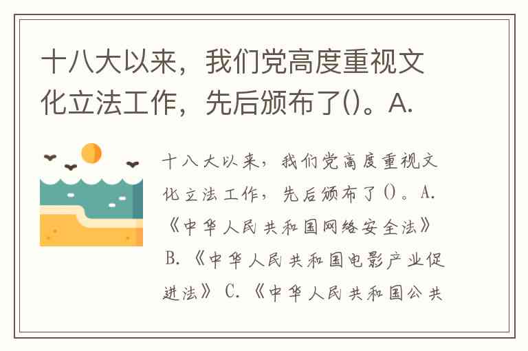 十八大以来,我们党高度重视文化立法工作,先后颁布了()。A.《中华人民共和国网络安全法》 B.《中华人民共和国电影产业促进法》 C.《中华人民共和国公共文化服务保障法》 D.《全国人民代表大会常务委员会关于加强网络信息保护的决定》