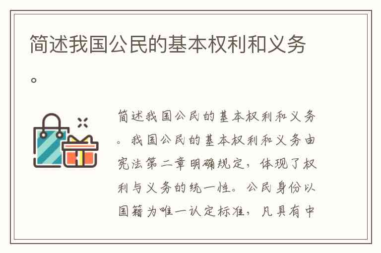 我国公民的基本权利和义务由宪法第二章明确规定,体现了权利与义务的统一性。公民身份以国籍为唯一认定标准,凡具有中华人民共和国国籍的人,在法律面前一律平等并平等享有权利、履行义务。