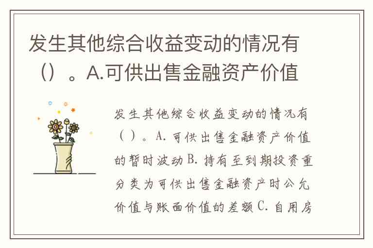 发生其他综合收益变动的情况有()。A.可供出售金融资产价值的暂时波动 B.持有至到期投资重分类为可供出售金融资产时公允价值与账面价值的差额 C.自用房产、存货转为公允价值模式下的投资性房地产时,形成的增值额 D.权益法下被投资方其他综合收益变动时投资方“长期股权投资”价值的相应调整