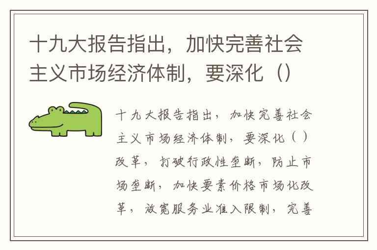 党的十九大报告指出,加快完善社会主义市场经济体制,要深化商事制度改革,打破行政性垄断,防止市场垄断,加快要素价格市场化改革,放宽服务业准入限制,完善市场监管体制。这一表述在多个权威文献中得到明确印证,例如《为企业发展解决实际问题》和《首届中国公平竞争政策宣传周学习宣传材料》均直接引用了"深化商事制度改革"这一具体内容。