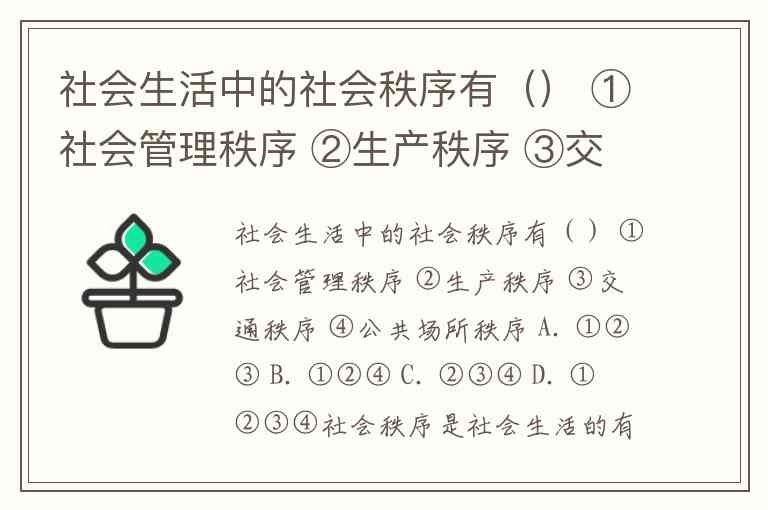 社会生活中的社会秩序有() ①社会管理秩序 ②生产秩序 ③交通秩序 ④公共场所秩序 A. ①②③ B. ①②④ C. ②③④ D. ①②③④