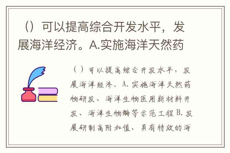 ()可以提高综合开发水平,发展海洋经济。A.实施海洋天然药物研发、海洋生物医用新材料开发、海洋生物酶等示范工程 B.发展研制高附加值、具有特效的海洋功能食品和生物制品 C.推进海洋生态经济、循环经济和节能减排,充分挖掘海洋文化 D.大力发展海洋生物医药新产品,形成具有竞争力的海洋生物医药产业集群