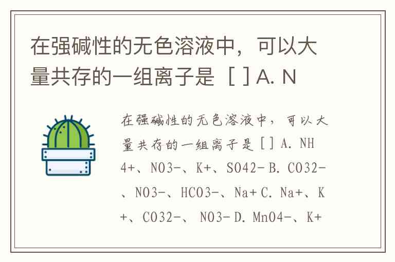 在强碱性的无色溶液中,可以大量共存的一组离子是 [ ] A. NH4+、NO3-、K+、SO42- B. CO32-、NO3-、HCO3-、Na+ C. Na+、K+、CO32-、 NO3- D. MnO4-、K+、Na+、SO42-