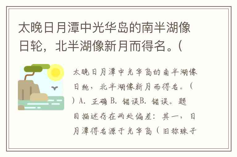 B. 错误。题目描述存在两处偏差:其一,日月潭得名源于光华岛(旧称珠子屿、拉鲁岛)分隔的湖形特征,北半湖状如日轮,南半湖形如弯月,而非题目中“南半湖像日轮,北半湖像新月”的颠倒表述;其二,“太晚日月潭”表述有误,正确名称为“日月潭”,位于中国台湾省南投县。
