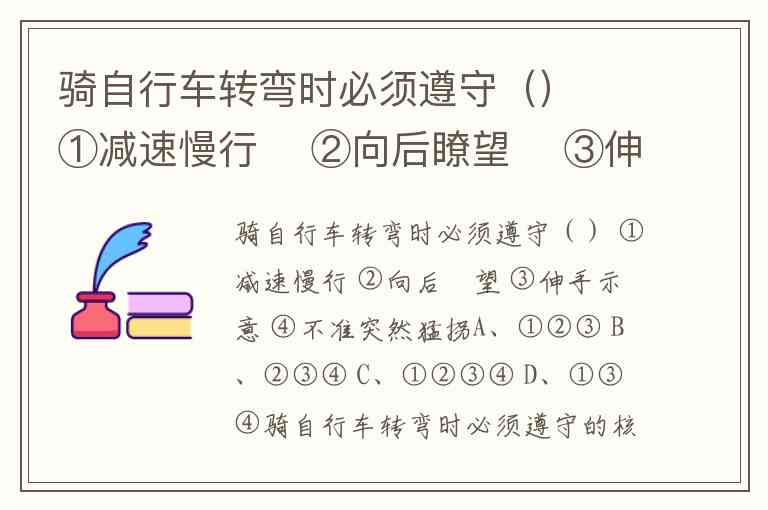 骑自行车转弯时必须遵守() ①减速慢行 ②向后瞭望 ③伸手示意 ④不准突然猛拐A、①②③ B、②③④ C、①②③④ D、①③④