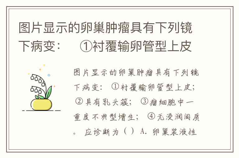 图片显示的卵巢肿瘤具有下列镜下病变: ①衬覆输卵管型上皮; ②具有乳头簇; ③瘤细胞中一重度不典型增生; ④无浸润间质。 应诊断为() A. 卵巢浆液性乳头状囊腺瘤 B. 卵巢浆液性乳头状囊腺癌 C. 卵巢浆液性腺纤维瘤 D. 卵巢交界性浆液性乳头状囊腺瘤 E. 卵巢黏液性乳头状囊腺癌