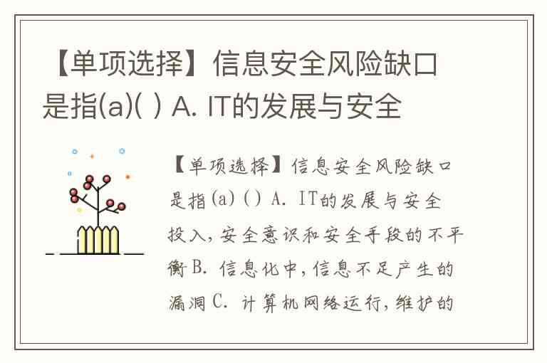 【单项选择】信息安全风险缺口是指(a)( ) A. IT的发展与安全投入,安全意识和安全手段的不平衡 B. 信息化中,信息不足产生的漏洞 C. 计算机网络运行,维护的漏洞 D. 计算中心的火灾隐患