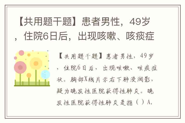 这一时间节点的划分并非随意设定。研究表明,住院5天后患者接触医院环境中耐药菌株的概率大幅增加,且自身免疫力因基础疾病和治疗干预进一步降低。例如,我国一项研究显示,由耐药菌引起的晚发性HAP死亡率是普通感染的2~3倍。因此,题干中患者住院6日后出现的肺炎,完全符合晚发性HAP的诊断标准。