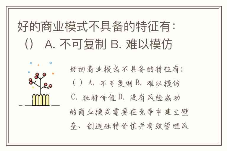 好的商业模式不具备的特征有:() A. 不可复制 B. 难以模仿 C. 独特价值 D. 没有风险