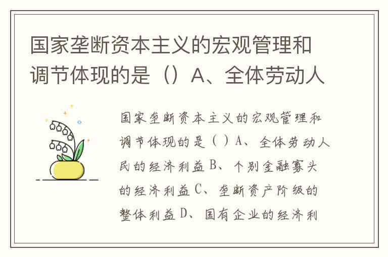 国家垄断资本主义的宏观管理和调节体现的是()A、全体劳动人民的经济利益 B、个别金融寡头的经济利益 C、垄断资产阶级的整体利益 D、国有企业的经济利益