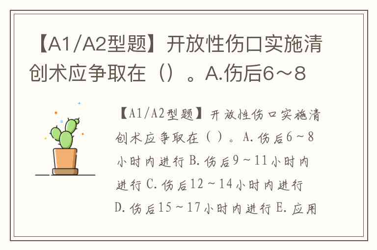 【A1/A2型题】开放性伤口实施清创术应争取在()。A.伤后6~8小时内进行 B.伤后9~11小时内进行 C.伤后12~14小时内进行 D.伤后15~17小时内进行 E.应用抗生素的情况下可延至24小时