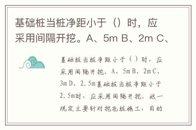 基础桩当桩净距小于()时,应采用间隔开挖。A、5m B、2m C、3m D、2.5m