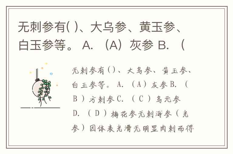 无刺参有( )、大乌参、黄玉参、白玉参等。 A. (A)灰参 B. ( B )方刺参 C. ( C )乌元参 D. ( D )梅花参