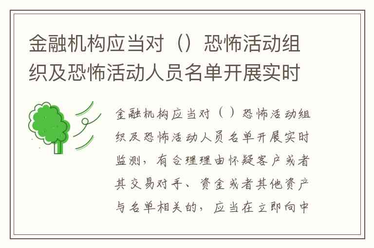 金融机构应当对三类恐怖活动组织及人员名单开展实时监测,包括中国政府发布或要求执行的名单、联合国安理会决议所列名单,以及中国人民银行要求关注的其他涉嫌恐怖活动的组织及人员名单。这一要求在《金融机构大额交易和可疑交易报告管理办法》第十八条中明确规定,体现了我国反洗钱与反恐融资监管的多层次性和国际义务的统一性。