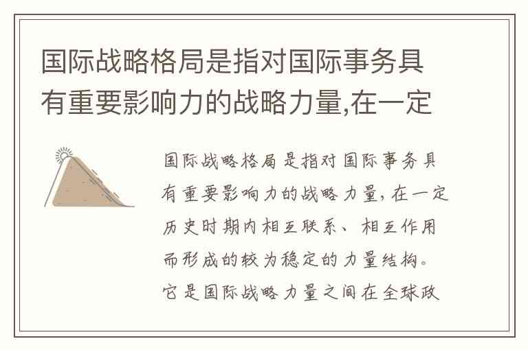 国际战略格局是指对国际事务具有重要影响力的战略力量,在一定历史时期内相互联系、相互作用而形成的较为稳定的力量结构。它是国际战略力量之间在全球政治层面上的实力对比关系。国际战略格局不包括:( ) A. 国际政治格局 B. 国际经济格局 C. 国际军事格局 D. 国际文化格局