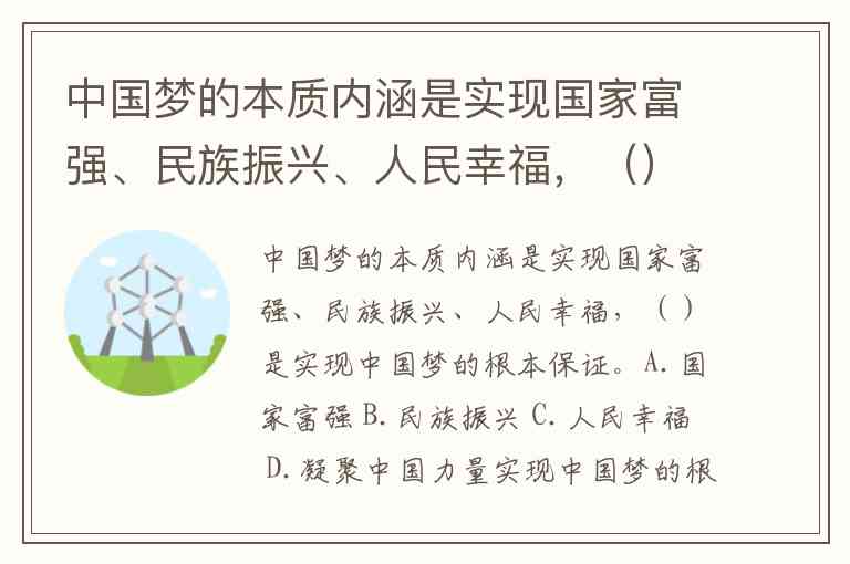 中国梦的本质内涵是实现国家富强、民族振兴、人民幸福,()是实现中国梦的根本保证。A.国家富强 B.民族振兴 C.人民幸福 D.凝聚中国力量