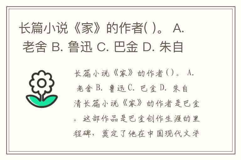 长篇小说《家》的作者( )。 A. 老舍 B. 鲁迅 C. 巴金 D. 朱自清