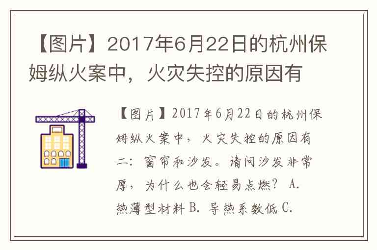 【图片】2017年6月22日的杭州保姆纵火案中,火灾失控的原因有二:窗帘和沙发。请问沙发非常厚,为什么也会轻易点燃? A. 热薄型材料 B. 导热系数低 C. 氧气供应多 D. 上述答案都对