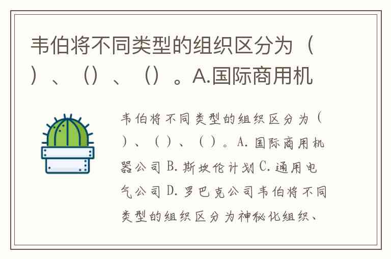 题目选项中A.国际商用机器公司、C.通用电气公司属于合理—合法化组织(官僚制)的现实案例,而B.斯坎伦计划是激励机制、D.罗巴克公司(如英国马莎百货前身)历史上可能兼具传统与理性特征。但严格对应韦伯理论原初分类的组织类型应为:神秘化组织、传统组织、合理—合法化组织。