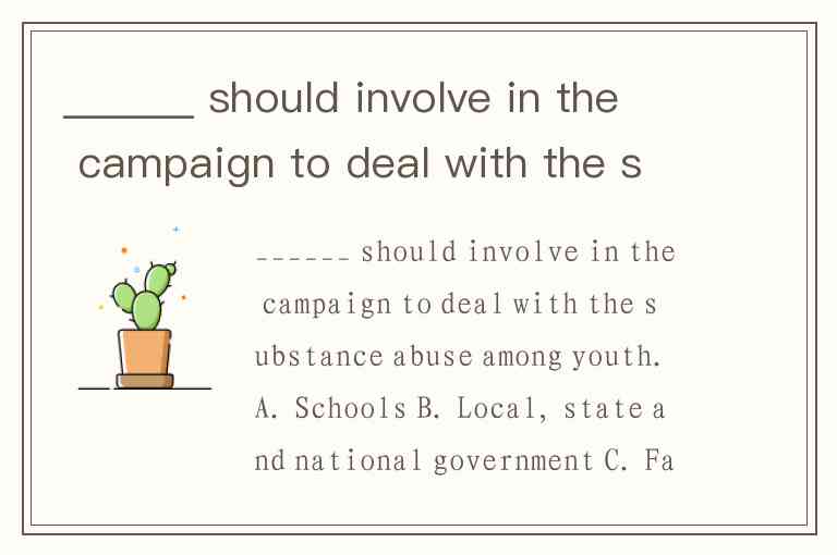 ______ should involve in the campaign to deal with the substance abuse among youth. A. Schools B. Local, state and national government C. Family and community D. All of the above