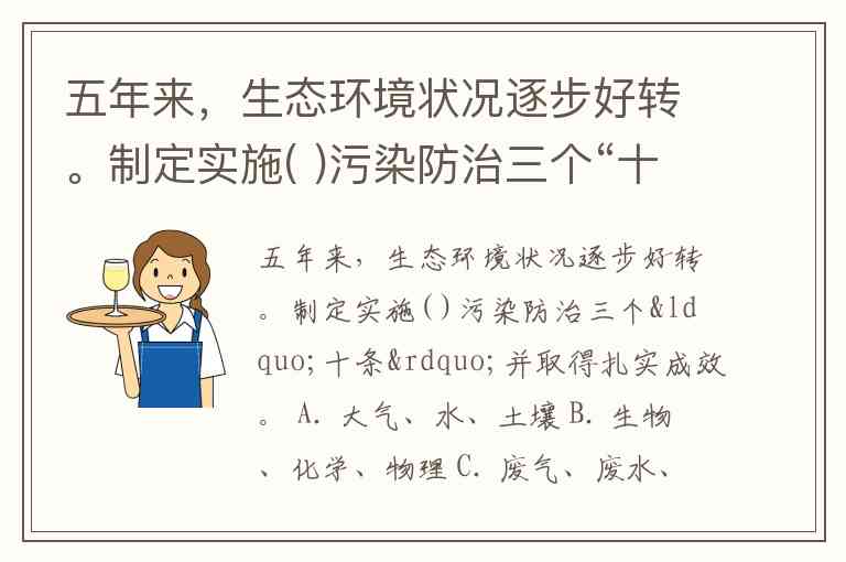 五年来,生态环境状况逐步好转。制定实施( )污染防治三个“十条”并取得扎实成效。 A. 大气、水、土壤 B. 生物、化学、物理 C. 废气、废水、噪声