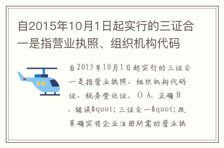 自2015年10月1日起实行的三证合一是指营业执照、组织机构代码证、税务登记证。() A. 正确 B. 错误
