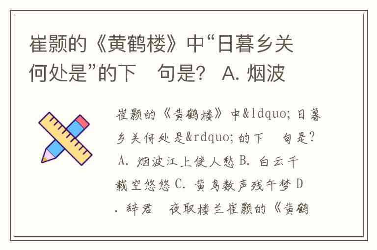 崔颢的《黄鹤楼》中“日暮乡关何处是”的下句是? A. 烟波江上使人愁 B. 白云千载空悠悠 C. 黄鸟数声残午梦 D. 辞君夜取楼兰