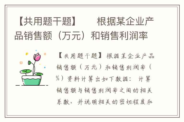 由于您未提供具体的产品销售额和销售利润率数据,无法直接计算相关系数。不过,我们可以通过通用方法框架和案例演示,说明如何分析两者的相关性。以下是完整解决方案: