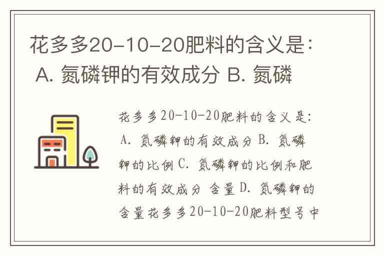 花多多20-10-20肥料的含义是: A. 氮磷钾的有效成分 B. 氮磷钾的比例 C. 氮磷钾的比例和肥料的有效成分 含量 D. 氮磷钾的含量