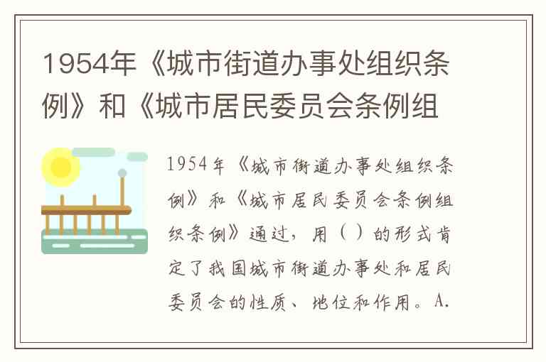 1954年《城市街道办事处组织条例》和《城市居民委员会条例组织条例》通过,用()的形式肯定了我国城市街道办事处和居民委员会的性质、地位和作用。A.文件 B.法律 C.政策 D.命令