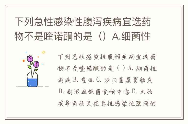 下列急性感染性腹泻疾病宜选药物不是喹诺酮的是()A.细菌性痢疾 B.霍乱 C.沙门菌属胃肠炎 D.副溶血弧菌食物中毒 E.大肠埃希菌肠炎