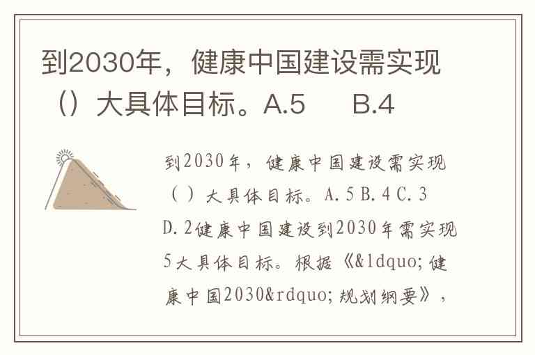 到2030年,健康中国建设需实现()大具体目标。A.5 B.4 C.3 D.2